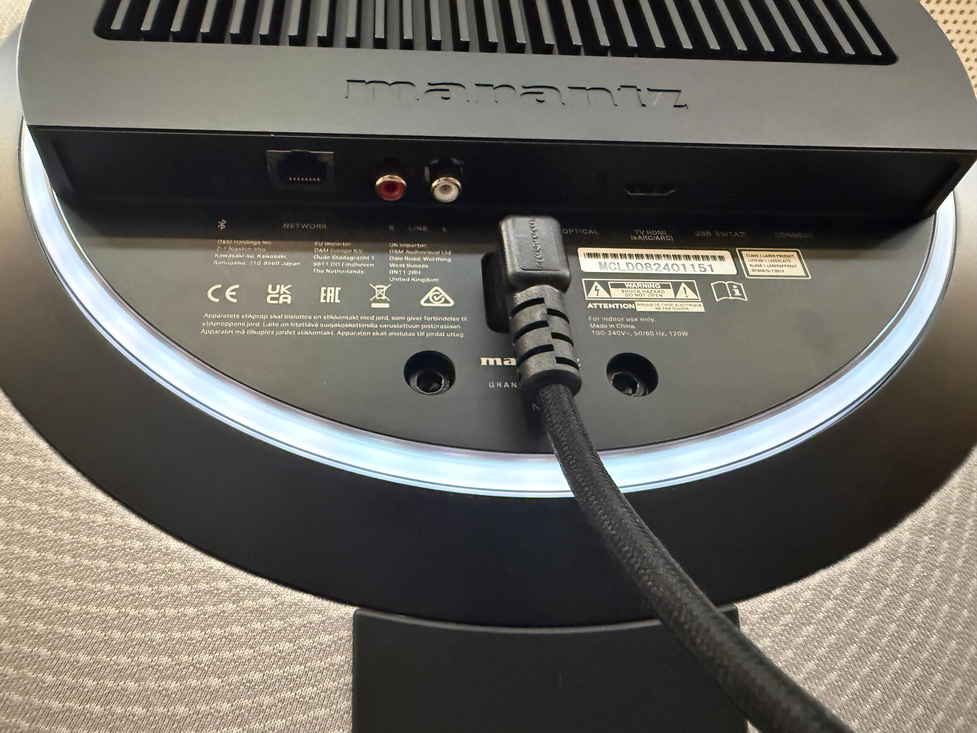 Na zadní straně je veškerá konektivita zakomponovaná pod kryt, byť ho v případě zájmu lze sejmout pro praktičtější přístup ke všem rozhraním. Ale „neviditelnost“ má své místo, neb Horizon nejen, že může být na zdi, na zmíněné kamenné podstavě, ale také na elegantní trojnožce volně v prostoru – pak lze kabely vést úchytkami na nožkách onoho stojanu.