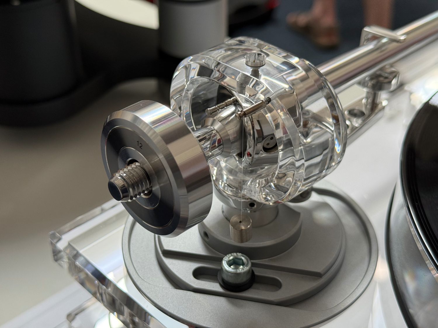 Tak jako každý jiný kousek celku, i použité rameno TA9 je tvořeno zářivou kombinací leštěného kovu a akrylu. Konstrukčně je identické s tím v top modelu M8xTT, jen kratší, tedy devítipalcové. Má DIN výstup a hlavička je pevnou součástí rovného tvaru. Jde o hliníkový obrobek, závažíčko na konci je opatřeno elastomerovým tlumením pro potlačení rezonancí. Přizpůsobit lze VTA i azimut, což se hodí, protože v balení není přenoska a musíte si tak vybrat podle chuti. Pokud byste snad nechtěli používat toto konkrétní rameno, základna snadno pojme širokou škálu standardních řešení.