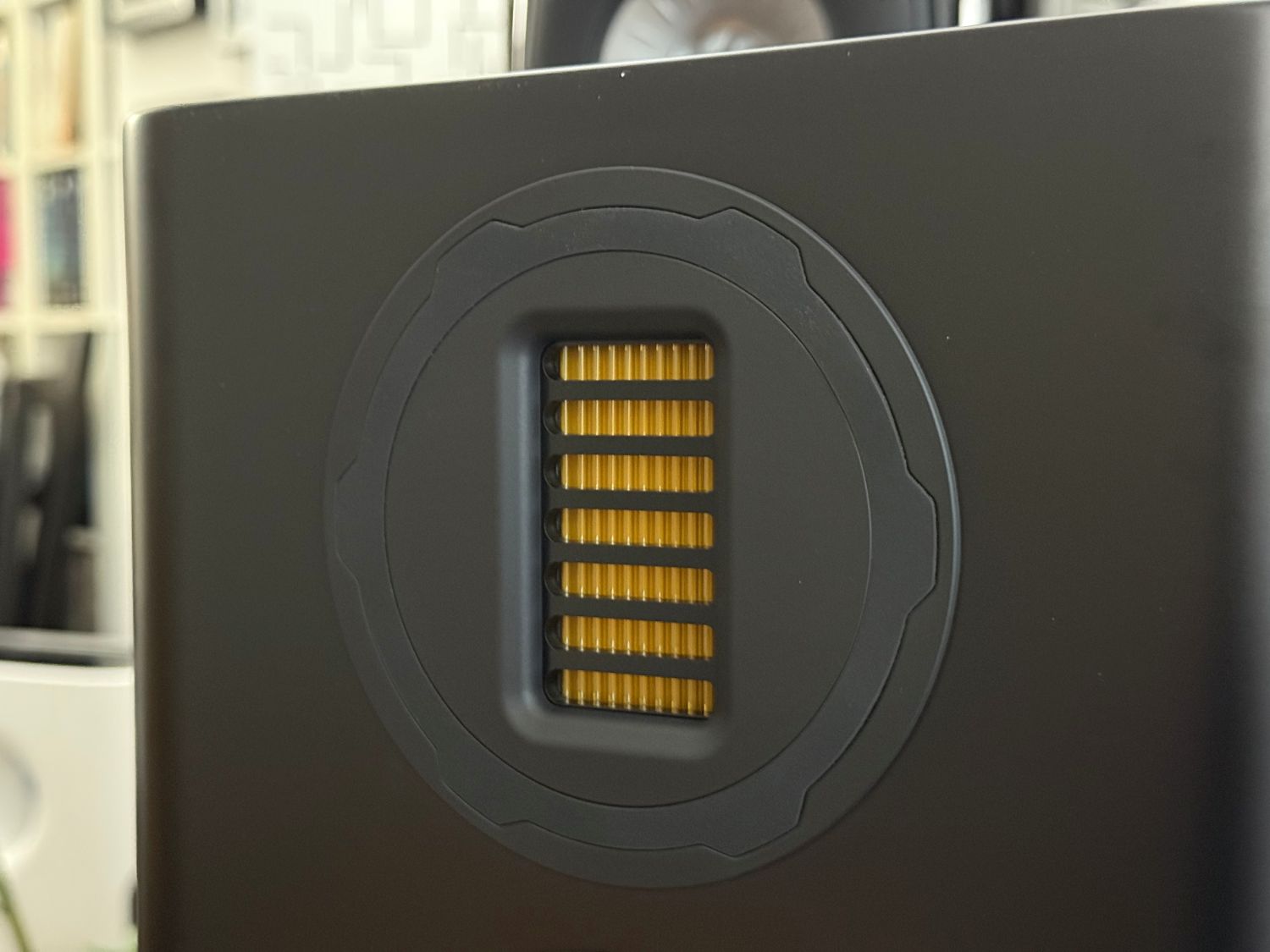 Skříně EVO5.4 se lehkým obloukem směrem vzad zužují, na zádech vidíte jen jediný pár reproterminálů, obklopený minimem plochy s informacemi. Styl je tedy velice čistý a úhledný. Pod tímto úhlem však můžete také popatřit na výdech bassreflexového systému – ten prochází zmíněnou kovovou základnou v obdélníkovém profilu jak dozadu, tak do boků, přičemž ústí nátrubku je zhruba uprostřed spodní stěny ozvučnice.