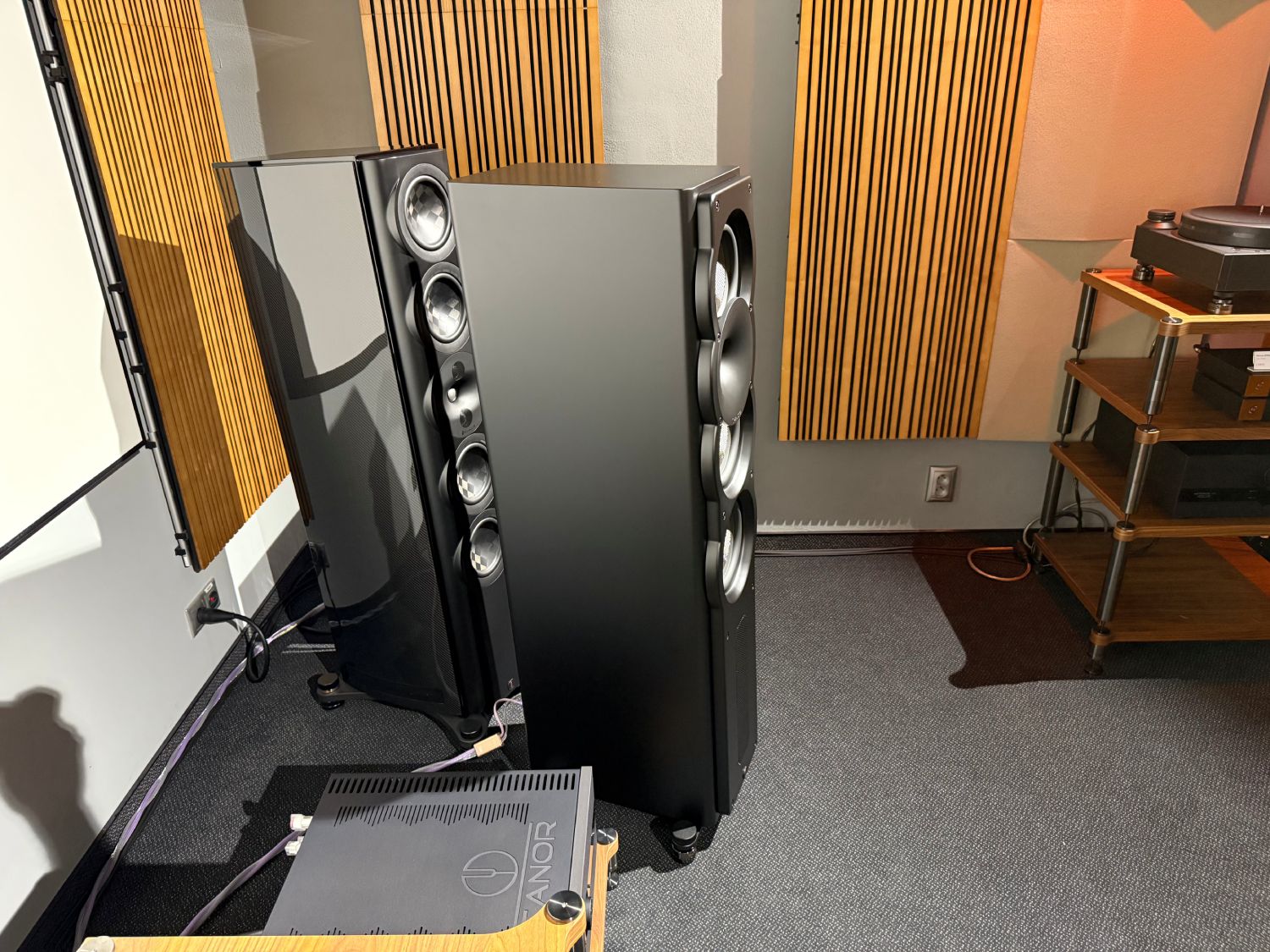 Perlisten A4t jsme měli možnost poslouchat v hlavním, akusticky precizně ošetřeném showroomu dovozce v Žilině. Hráli jsme primárně na zdroji signálu Grimm Audio MU1, který byl zapojený buď do digitálních vstupů Canor Virtus A3 nebo převodníku Bricasti M21. Nakonec jsme reprosoustavy zapojili i do sestavy Canor Hyperion P1 / Virtus S1S (na každý kanál 1 kus). Komponenty napájel GMG Power Harmonic Hammer Exclusive. Streamovalo se pak přes ekosystém na bázi SOtM. Ke srovnání jsme měli S7t Limited Edition ze stejné stáje, ale i Harbeth Monitor 30.3 XD2 nebo Ø Audio Icon 12.