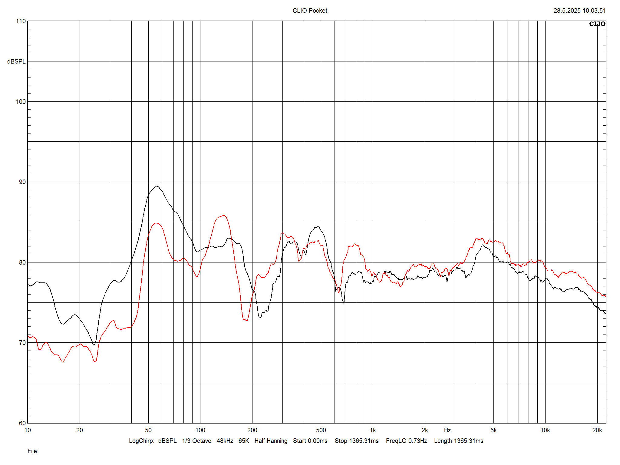 Frekvenční odezva na poslechovém místě (FFT) - levý kanál (červená) a pravý kanál (černá)