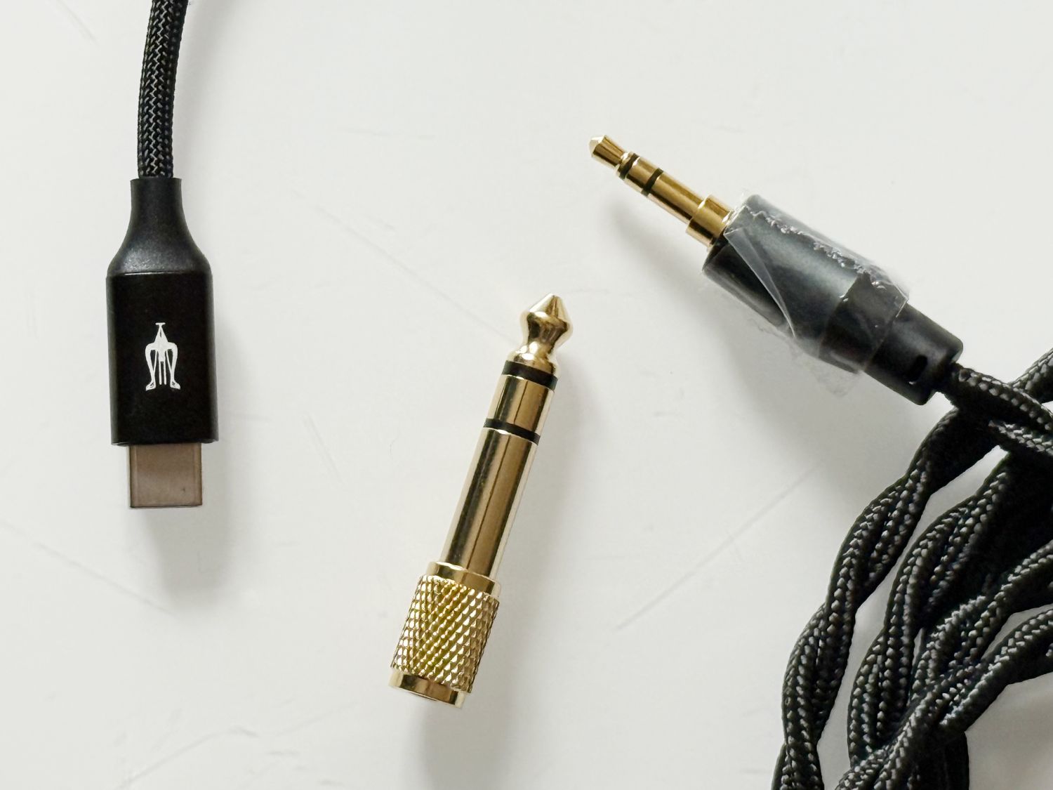 Signál do obou mušlí sluchátek vede 1,8 m dlouhý kabel z bezkyslíkaté mědi a s dvojitým zkrutem. Je velice pružný a ohebný, přesto mu pevnost zajišťuje přítomné kevlarové vlákno. Koncovka je klasický 3,5 mm jack, v balení je ještě 6,3 mm redukce a hlavně na míru navržený adaptér z malého jacku na USB-C, do kterého výrobce vybral D/A převodník i zesilovač podle svých preferencí – a hraje to překvapivě dobře. Na cestovní poslouchání to bohatě stačí bez nutnosti hledat cokoliv jiného.